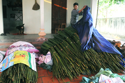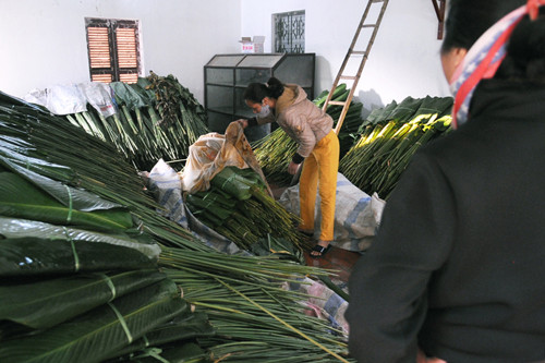 Trong làng, gần như nhà nào cũng có kho để lá dong. Thỉnh thoảng, khách buôn lại vào xem, chọn lá.