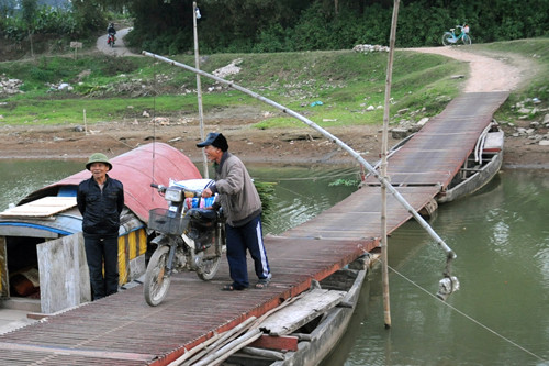 Một người đàn ông dắt xe máy, phía sau buộc bó lá dong, trên chiếc cầu tạm dẫn vào làng Tràng Cát (xã Kim An, Thanh Oai, Hà Nội). Làng Tràng Cát là nơi duy nhất thuộc Thủ đô có nghề truyền thống trồng lá dong.