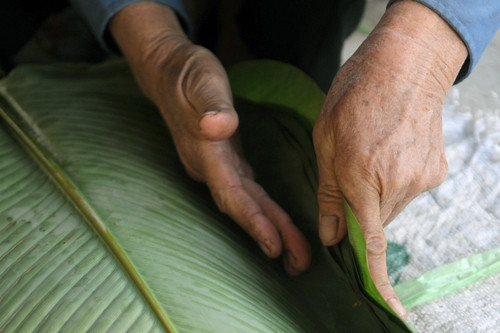 Sau khi xếp đủ 100 tàu, bà gấp mép lá cho gọn. Công việc tưởng như đơn giản nhưng cũng đòi hỏi bàn tay thuần thục để bó lá trông đẹp mắt, không bị gãy dập.