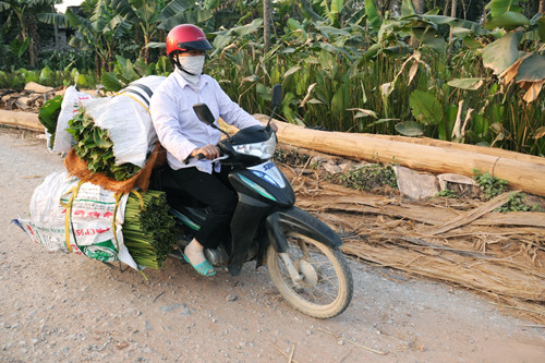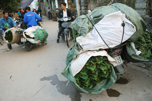 Một người buôn lá dong đang rời làng sau khi đã mua được hàng. Những ngày sát Tết, giá lá dong rất thất thường. Năm ngoái, 3 ngày sát Tết, giá lá dong tăng vọt, lên tới trên dưới 300 nghìn đồng/bó.
