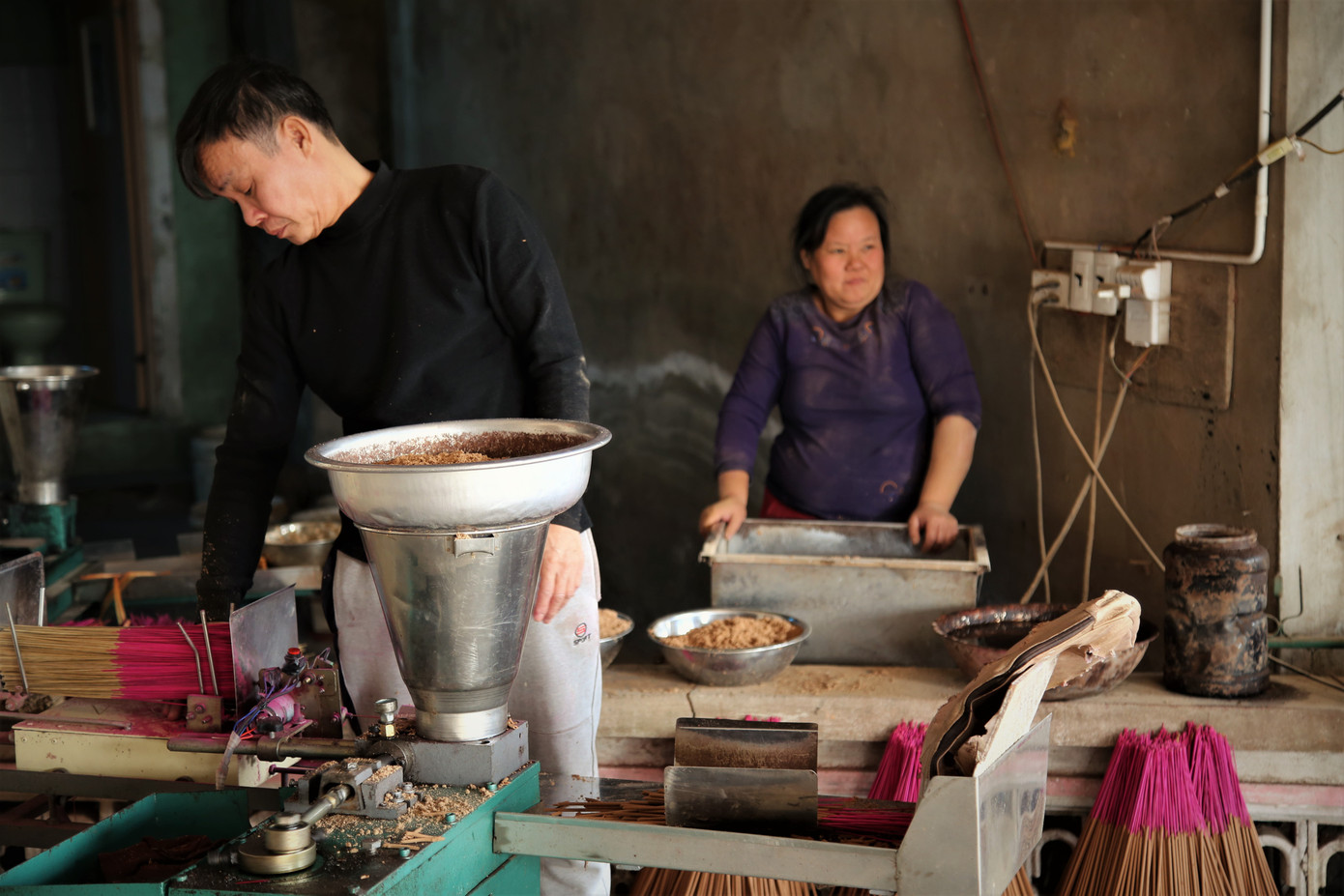 Bột hương được người dân trộn đều và cho vào máy để làm hương.