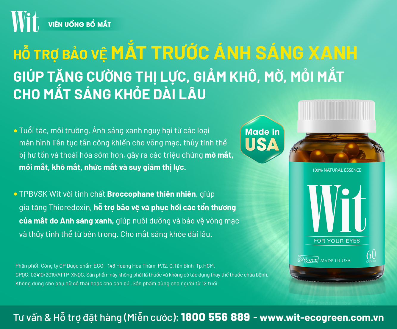 Trải qua nhiều năm nghiên cứu chuyên sâu, các nhà khoa học Mỹ đã cho ra đời sản phẩm Wit có chứa tinh chất Broccophane thiên nhiên (chiết xuất từ bông cải xanh rất giàu Sulforaphane) giúp gia tăng tổng hợp Thioredoxin tự nhiên. Thioredoxin chính là thành phần quan trọng duy trì sự trong suốt của thủy tinh thể và bảo vệ võng mạc hiệu quả trước các yếu tố gây hại cho mắt.