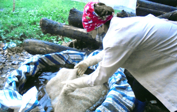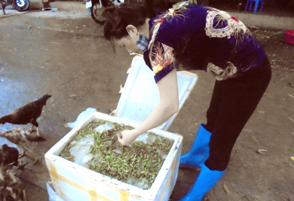 Trong thời gian chờ nước sôi, chị Hoa mở thùng xốp ra, châu chấu vẫn tươi do được ướp đá lạnh. Chỉ thời gian ngắn sau khi đá tan, châu chấu sống lại như bình thường. Chị Hoa đem châu chấu đi rửa sạch.