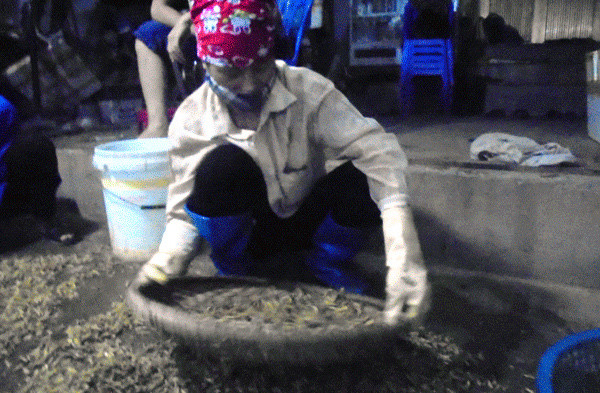 Vì thế, khoảng 18h, người dân làng Lê Thanh đổ đến nhà chị để nhận châu chấu về làm. Công việc này đã trở nên quen thuộc tại đây. Chỉ với 5 hộ buôn bán châu chấu, hàng trăm người khác đã có việc làm.