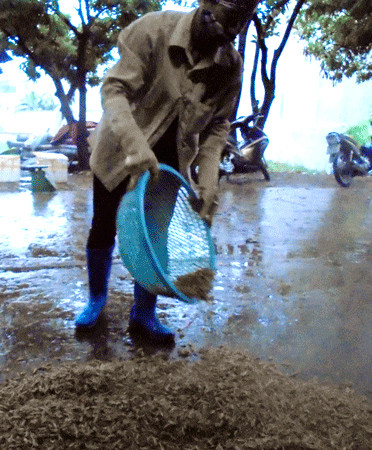 Luộc chừng 5 phút, chị Hoa vớt châu chấu rồi đổ ra để nguội. Lúc này, châu chấu ngả màu vàng nhạt. Chị sàng sẩy để nhặt ra châu chấu non, con già sẽ phải cấu cánh và cấu càng.