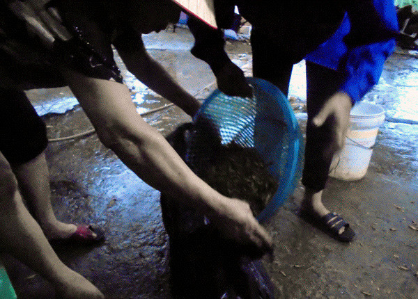 Ngày nào cũng vậy, công đoạn “cấu chấu” phải kết thúc trước 11h00 đêm. Lúc này, anh Huấn và chị Xoan chở hàng tạ châu chấu đã qua sơ chế đến chợ đầu mối Long Biên (Hà Nội) để bán, nhanh cũng phải 3h sáng mới hết. Từ đây, châu chấu tỏa đi khắp các chợ dân sinh hay đổ trực tiếp cho các quán nhậu.