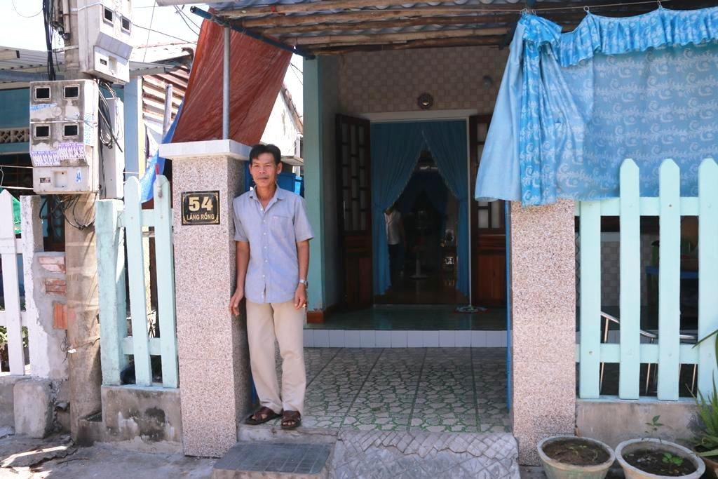 Anh Trần Văn Thu - người mất một lúc 12 người thân trong trận đại hồng thủy cuối năm 1999 - bên căn nhà mới của mình tại làng Rồng.