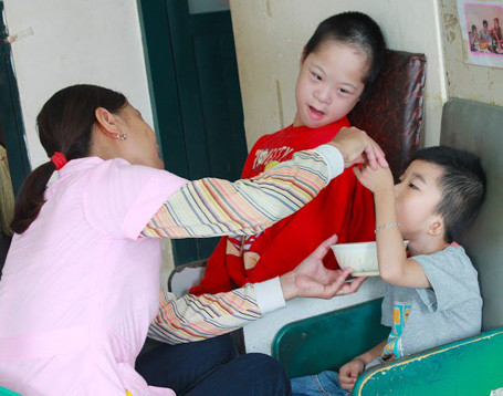 Giáo viên lớp Chim non (Trung tâm Sao Mai) lại ghi nhớ thật nhiều kỷ niệm. Bé Tài có thói quen đưa tay vào… khoắng bồn cầu, các cô phải sử dụng lời nói nghiêm nghị với bé để tạo phản xạ có điều kiện, giúp bé nhận thức đó là hành động xấu.
