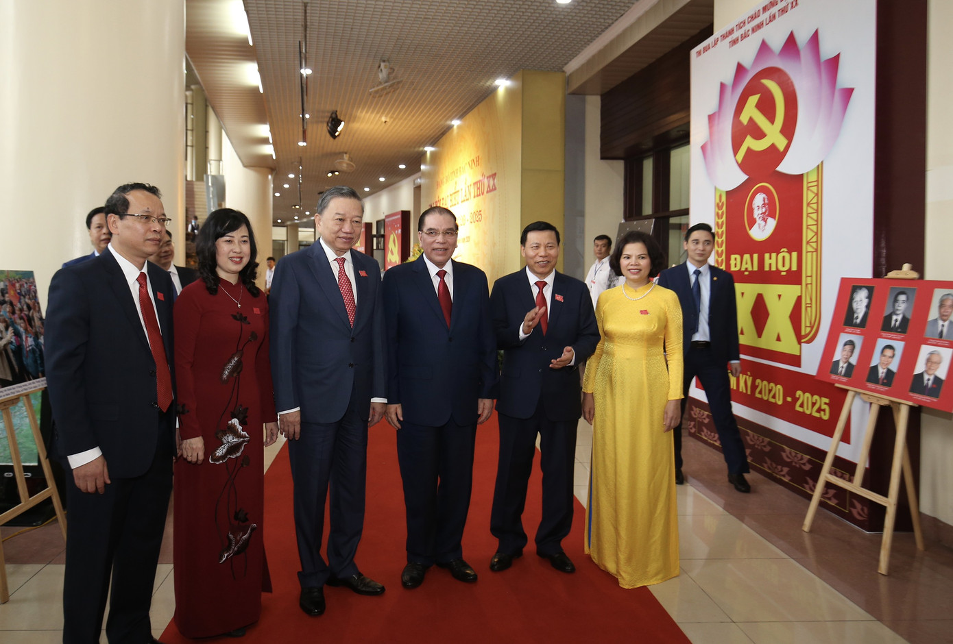 Bí thư Tỉnh ủy Bắc Ninh Nguyễn Nhân Chiến giới thiệu triển lãm ảnh chào mừng Đại hội Đảng bộ tỉnh với Bộ trưởng Tô Lâm. Ảnh: Như Ý
