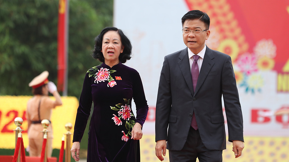 Ủy viên Bộ Chính trị, Bí thư Trung ương Đảng, Trưởng ban Dân vận Trung ương Trương Thị Mai và Bộ trưởng Bộ Tư pháp Lê Thành Long đến dự đại hội.