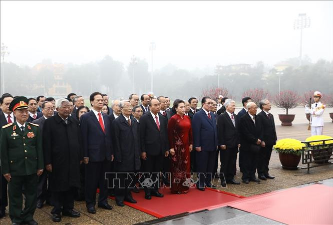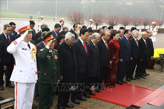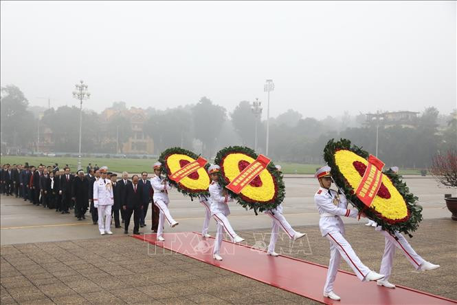 Các đồng chí lãnh đạo, nguyên lãnh đạo Đảng, Nhà nước đặt vòng hoa và vào Lăng viếng Chủ tịch Hồ Chí Minh. Ảnh: Văn Điệp/TTXVN