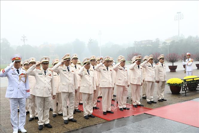 Đoàn đại biểu Đảng ủy Công an Trung ương, Bộ Công an đặt vòng hoa và vào Lăng viếng Chủ tịch Hồ Chí Minh. Ảnh: Văn Điệp/TTXVN