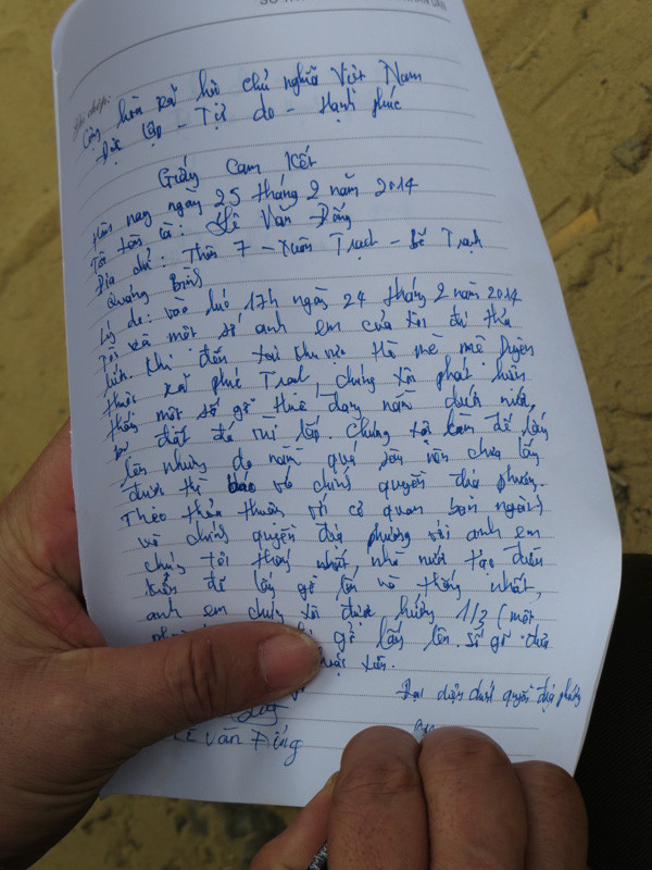 Ông Tân cho rằng, sở dĩ có bản cam kết đó là do ông Trần Quang Vũ, Phó Chủ tịch huyện chỉ đạo phải ký để ổn định tình hình. Về tính pháp lí của văn bản nói trên, ông Tân cũng không khẳng định được. Nhưng, nếu có sai thì sai tập thể, vì khi ông Tân ký có sự chứng kiến của lãnh đạo rất nhiều ban ngành và ai cũng biết là do ông Vũ chỉ đạo ký.
