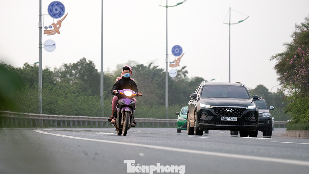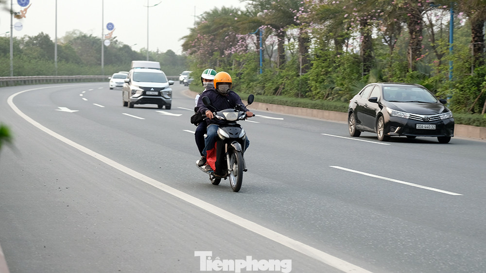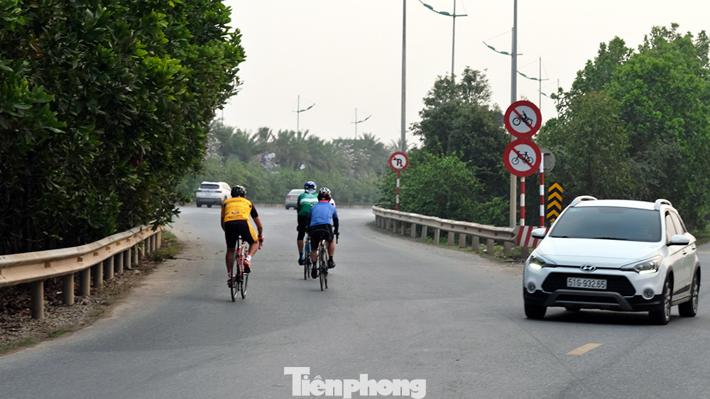 Dù đường Võ Nguyên Giáp đã có biển báo cấm xe mô tô, xe gắn máy và phương tiện thô sơ, tuy vậy, một đoàn “cua-rơ” trong trang phục quần áo thể thao, điều khiển xe đạp đua vẫn ung dung nối đuôi nhau lưu thông giữa những dòng ô tô đang chạy với tốc độ 80 - 90km/giờ về hướng Nội Bài.