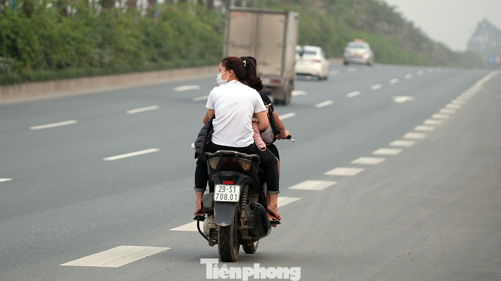 Đi xe máy, đầu không đội mũ bảo hiểm hồn nhiên đi vào cao tốc.
