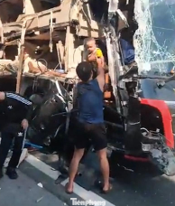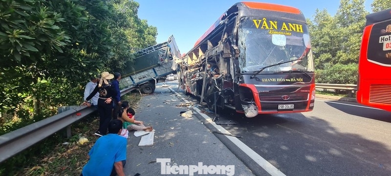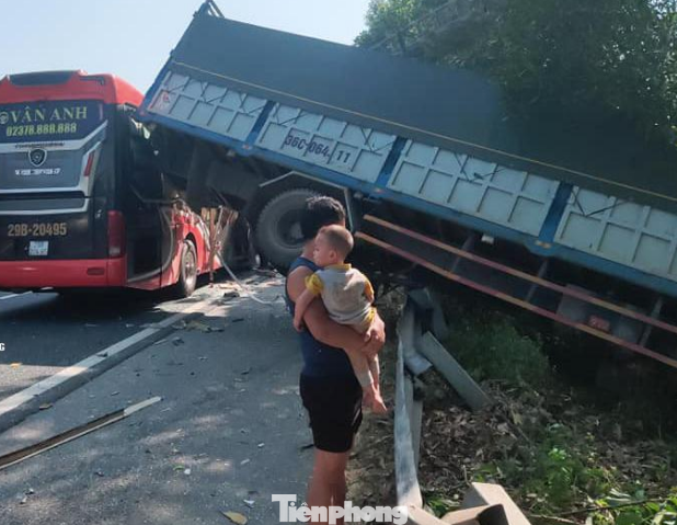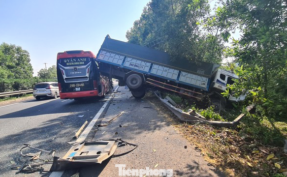 Sau cú tông mạnh, xe khách đẩy xe tải bay qua hàng rào sắt, nằm vắt ngang dải phân cách bên đường, đầu xe cắm xuống dốc ven đường cao tốc. Tài xế xe tải bị thương nặng phải đưa đi cấp cứu. Bản thân phụ xe tải khi xảy ra tai nạn đang nằm dưới gầm xe để sửa chữa nhưng rất may không bị nguy hiểm tới tính mạng.