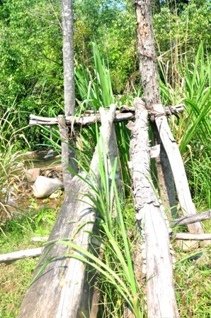 Để bước lên được cây cầu này, chúng tôi phải lần dò từng bước nếu không muốn lọt xuống suối. Cây cầu “lỏng lẻo” đến phát sợ. Cái được gọi là “lan can” cầu gồm 2 dây thép cột vào 2 gốc cây ở 2 bên suối, bên dưới được lát những mảnh gỗ tạm bợ, còn “đường dẫn” lên cầu được kê mấy cây gỗ mục.