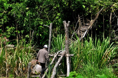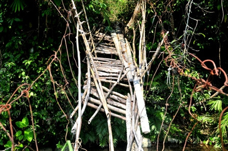 Lấy hết sức bình tĩnh, tôi “rón rén” bước lên cầu. Tuy nhiên, chưa đến giữa cầu thì không dám tiến xa hơn nữa bởi sự “rung và lắc” của cây cầu này. Cố gắng “toát hết mồ hôi” tôi cũng không thể đi hết cây cầu này được. Và dù có muốn sang bên kia nhưng cũng không thể sang được vì những cây gỗ lót mặt cầu đã “rơi rụng” gần hết.