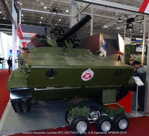 Nga là nước đi đầu trong lĩnh vực công nghệ này khi liên tiếp cho ra đời các mẫu robot quân sự. Mẫu phương tiện chiến đấu không người lái (UCGV) lần này có tên Vikhr (Whirlwind) được xây dựng dựa trên khung gầm của xe chiến đấu bộ binh nổi tiếng BMP-3. Có sự sáng tạo trong kết hợp khả năng hỏa lực mạnh và các cảm biến điều khiển từ xa này trên khung gầm xe chiến đấu bộ binh có sẵn là do, các khung gầm của loại xe BMP-3 rất dễ bảo dưỡng và sản xuất, chỉ cần sửa đổi và cải tiến trên dây truyền sản xuất vốn có, là có thể cho ra đời hàng loạt khung gầm UCGV. Ngoài ra chiếc Vikhr lại có thể phối hợp với nhiều loại phương tiện bọc thép vốn có trong trang bị của Nga như BMP-1, BMP-2, BTR-80/82… trong vai trò trinh sát và hỗ trợ hỏa lực.