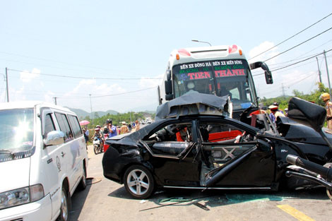 Xe khách biển kiểm soát 74B – 00237 khi đến ngã tư đường tránh – đường Bà Nà suối Mơ, đã đâm vào xe ô tô con hiệu Camry biển kiểm soát 43A – 12315. Ảnh: Công an Nhân dân.