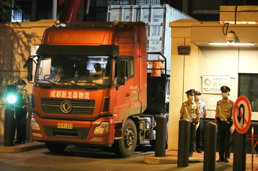 Xe tải rời khỏi lãnh sự quán tối 26/7. Ảnh: SCMP