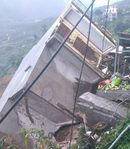 Theo đó, mưa to, đất đá sạt lở đã làm đổ nghiêng hẳn ngôi nhà 4 tầng của gia đình anh Nguyễn Công Hà (tổ 13, thị trấn Sa Pa) và hai nhà xây kiến cố khác liền kề bị hư hỏng nặng.