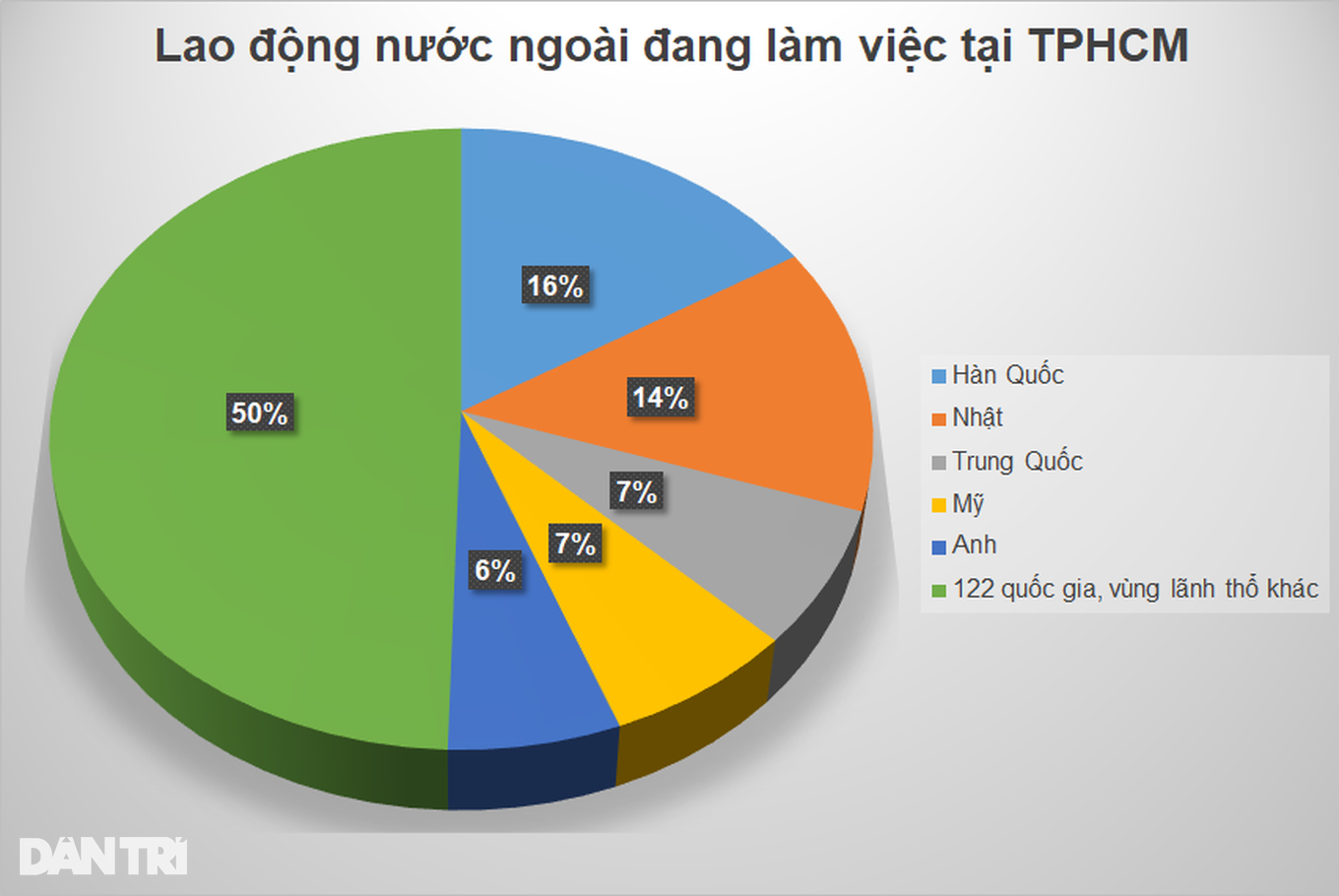 Trong số 127 quốc gia, vùng lãnh thổ có lao động đến làm việc trên địa bàn TPHCM, quốc gia có số lao động nước ngoài nhiều gồm: Hàn Quốc (1.671 người, chiếm 16,19% tổng số lao động), Nhật Bản (1.437 người, chiếm 13,92%), Trung Quốc (739 người, chiếm 7,16%), Hoa Kỳ (719 người, chiếm 6,97%), Anh (644 người, chiếm 6,24%)…