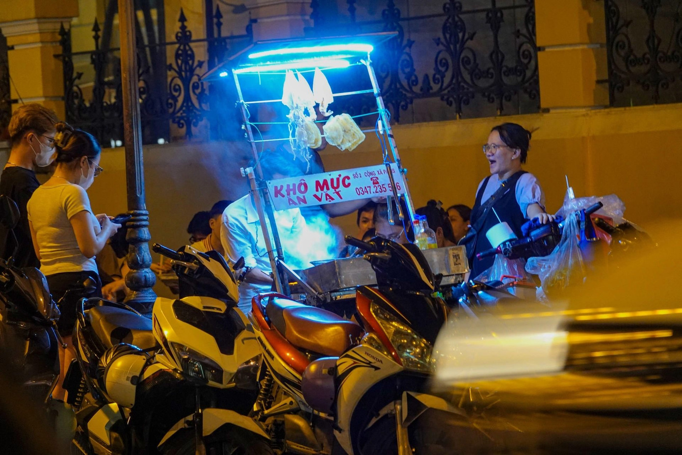 Tầm 18h, xe khô mực sáng đèn đón những thực khách đầu tiên. Bắt đầu từ đó tới hết đêm, anh Thể bận rộn không ngơi tay.