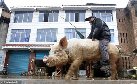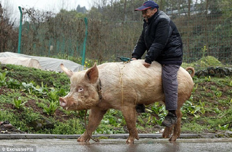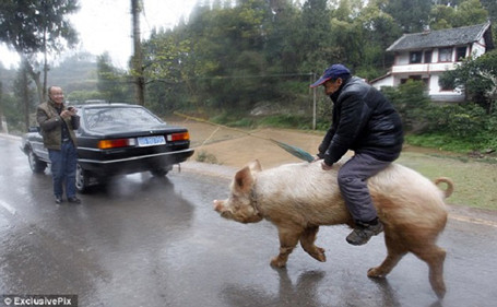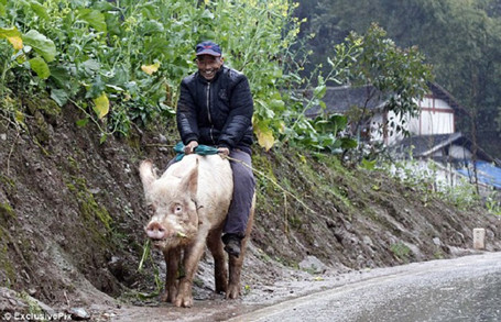 Người dân thành phố Trùng Khánh, Trung Quốc lâu nay đã quen thuộc với hình ảnh một người đàn ông ngồi trên lưng một chú lợn “cao to” để đi siêu thị.