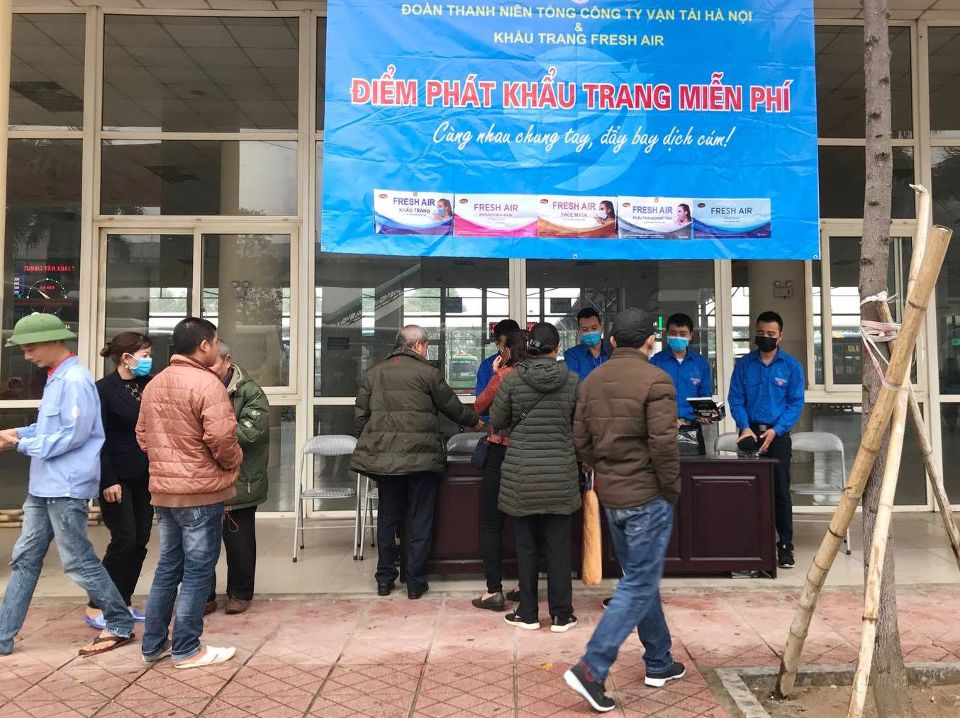Chỉ hơn một giờ có mặt, chúng tôi đã ghi nhận 2 điểm phát khẩu trang ở điểm trung chuyển xe buýt Kim Mã và bến xe Giáp Bát phát trên 2.000 khẩu trang cho khách.