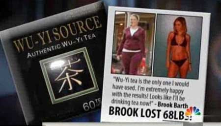 Xuất hiện trong chương trình truyền hình trực tiếp, Brook Shadwell, một bà mẹ2 con ở California (Mỹ) xuất hiện trong các quảng cáo trà giảm cân Wu-Yi củaTrung Quốc, cho hay: "Tôi thậm chí chưa từng thử hoặc uống loại trà này... Tôicũng không biết đó là loại trà gì".