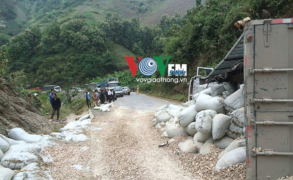 Vào khoảng 6 giờ 20 phút sáng nay (14/11), trên Quốc lộ 6, đoạn qua đèo Chiềng Đông, huyện Yên Châu (Sơn La), một chiếc xe đầu kéo biển kiểm soát 29C-38555 kéo sơ mi-rơ mooc biển kiểm soát 29R-000262 chở hàng tấn sắn khô đã bị lật.