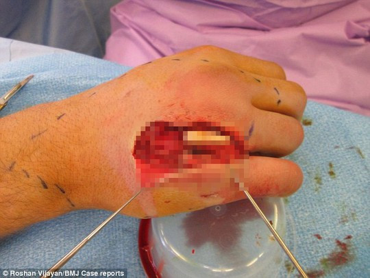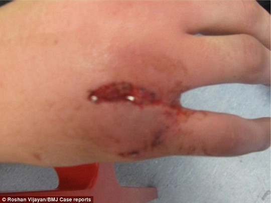 Daily Mail ngày 6/5 đưa tin các bác sĩ ở Bệnh viện Nữ hoàng Victoria ở hạt West Sussex, Anh đã tiếp nhận một trường hợp bàn tay sưng to do một chiếc răng mắc kẹt giữa các khớp ngón tay mà nạn nhân không hay biết.