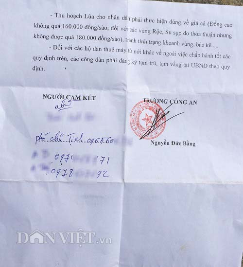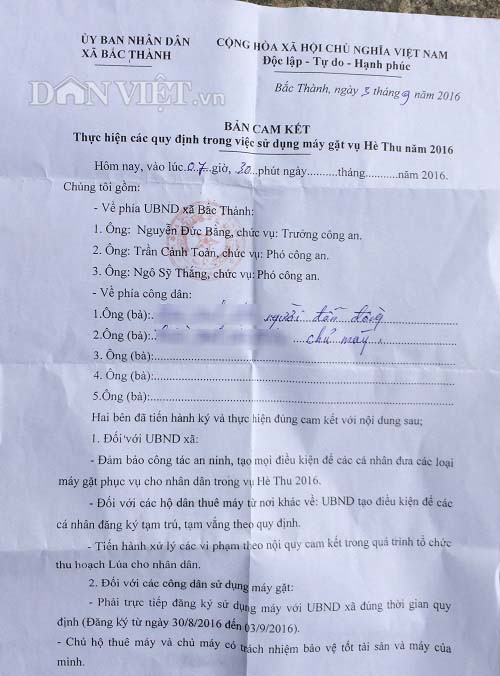 Trong khi đó anh Nguyễn Đức Khoái quê ở Nam Định chủ máy gặt cho biết: “Vào vụ mùa Hè Thu này, tôi đưa máy gặt từ quê vào gặt lúa thuê cho bà con ở xã Bắc Thành, nhưng khi đang gặt lúa cho bà con thì có mấy anh công an xã đến lập biên bản, bắt tôi ký vào giấy cam kết và nộp 2 triều đồng. Khi hỏi số tiền này là tiền gì, thì họ trả lời đó là tiền đảm bảo tình hình an ninh trật tự địa phương...”.