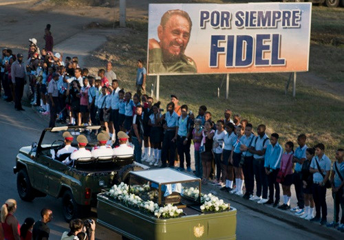 Theo CNN, ngay từ sáng sớm, người dân Cuba đã xếp hàng kín hai bên con đường dẫn đến nghĩa trang Santa Ifigenia để từ biệt lãnh tụ Fidel Castro lần cuối khi tro cốt của ông được đưa bắng xe quân sự từ quảng trường đến nơi chôn cất vào lúc 6h39. Ảnh: AP