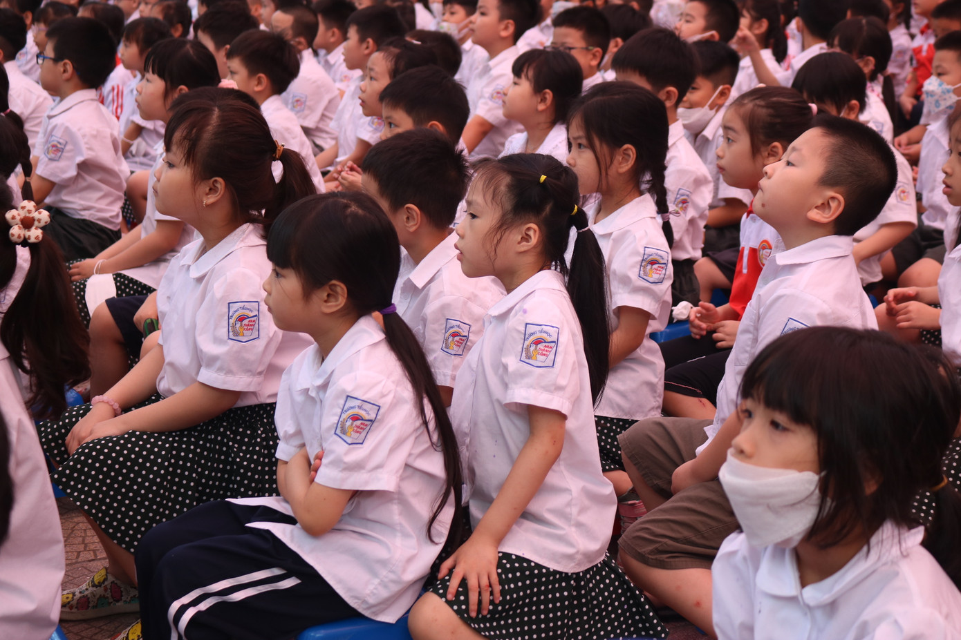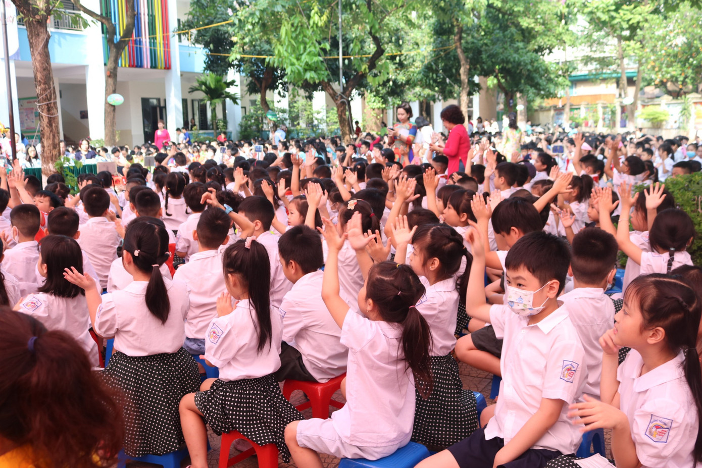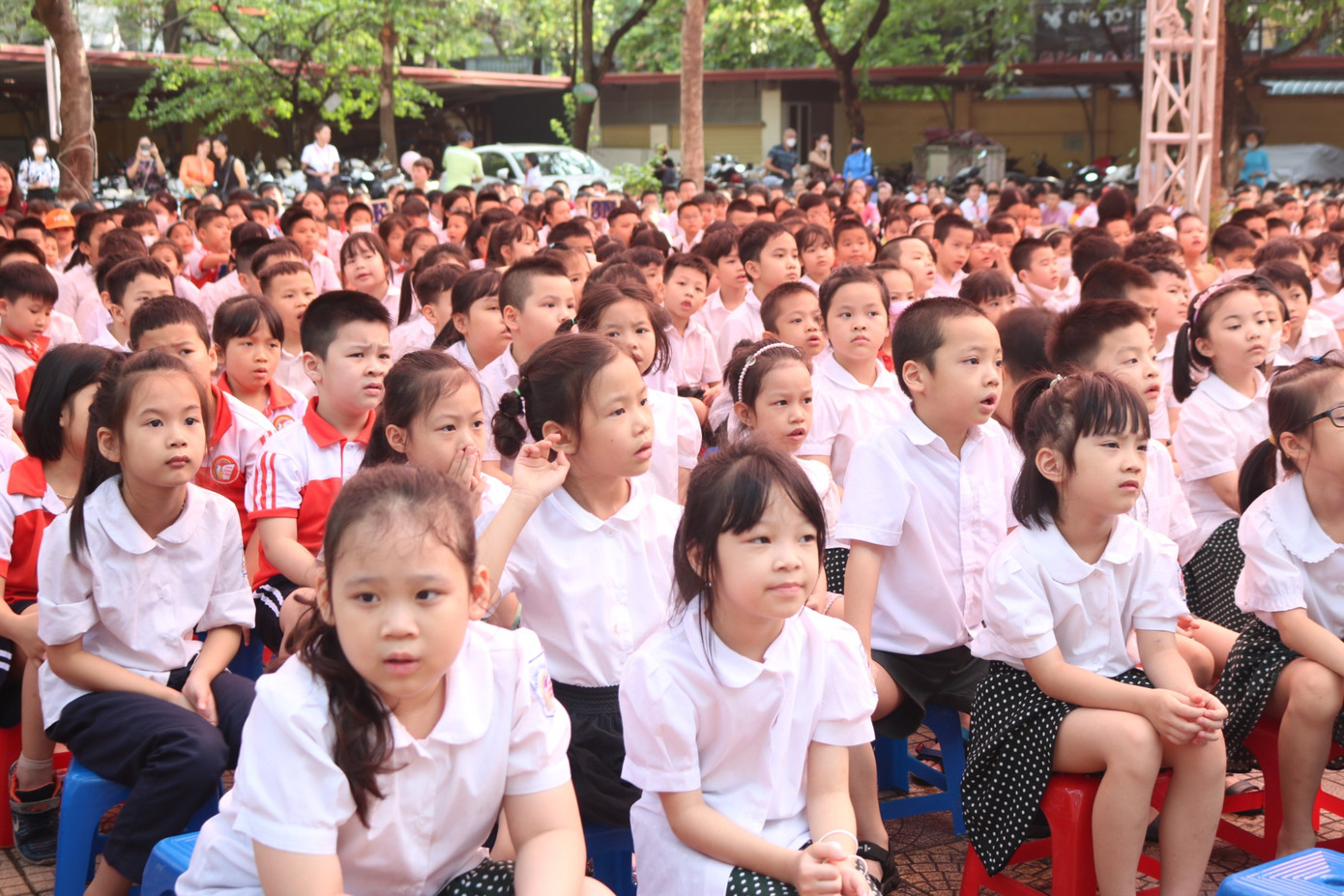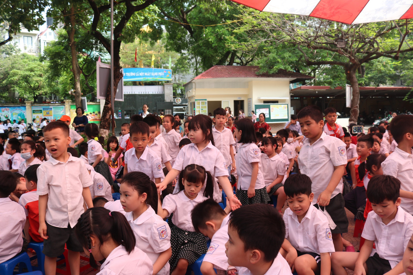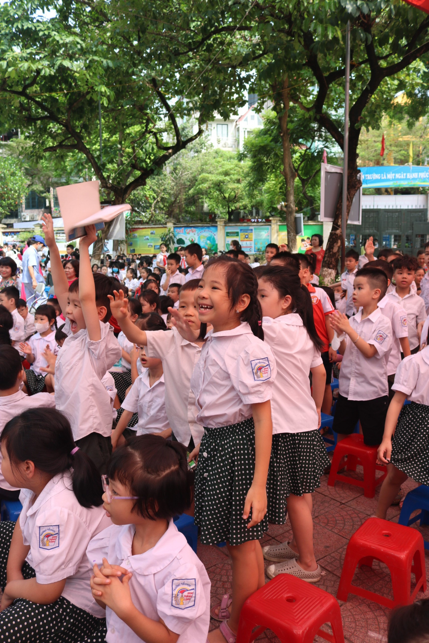 Sáng 25/5, lễ bế giảng năm học 2022 - 2023 của trường Tiểu học Nam Thành Công diễn ra trong sự hào hứng của các bạn tween. Khoảng 30 phút trước giờ bước vào buổi lễ, toàn bộ các bạn học sinh đã tập trung dưới sân trường, ổn định chỗ ngồi.