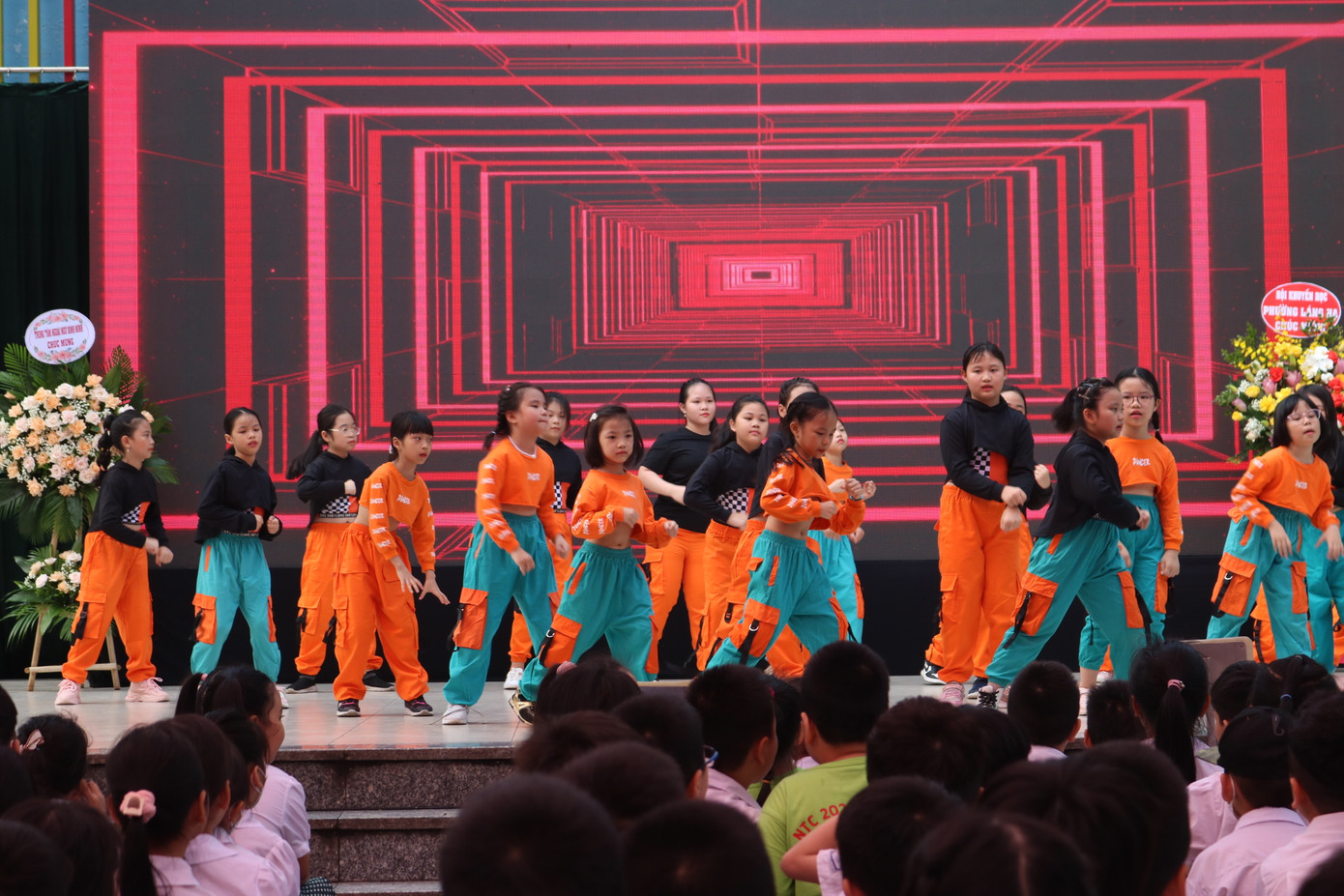 Các thành viên trong câu lạc bộ của trường cùng nhau khuấy động không khí đầu buổi lễ bằng các tiết mục vũ đạo sôi động. Tween ngồi dưới sân khấu cũng chăm chú theo dõi từng tiết mục, lắc lư theo điệu nhạc.