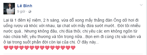 Cách đây ít giờ, trên trang cá nhân của mình, nhà báo Lê Bình đã có đôi dòng chia sẻ sau quyết định “gây sốc”. Cô viết: “Lại là 1 đêm kỷ niệm, 2h sáng, vừa dỗ xong mấy thằng đàn ông dở hơi đi uống rượu và khóc với nhau, lại chat với mấy đứa sướt mướt… Đời tôi nhiều nước quá. Nhưng không đâu, chị đùa thôi, chị yêu các em không ngôn từ nào chứa hết, yêu thương và tôn trọng nữa. Bọn em đi cùng chị vài năm và ở lại trong suốt phần đời còn lại của chị. Ở đây này”.