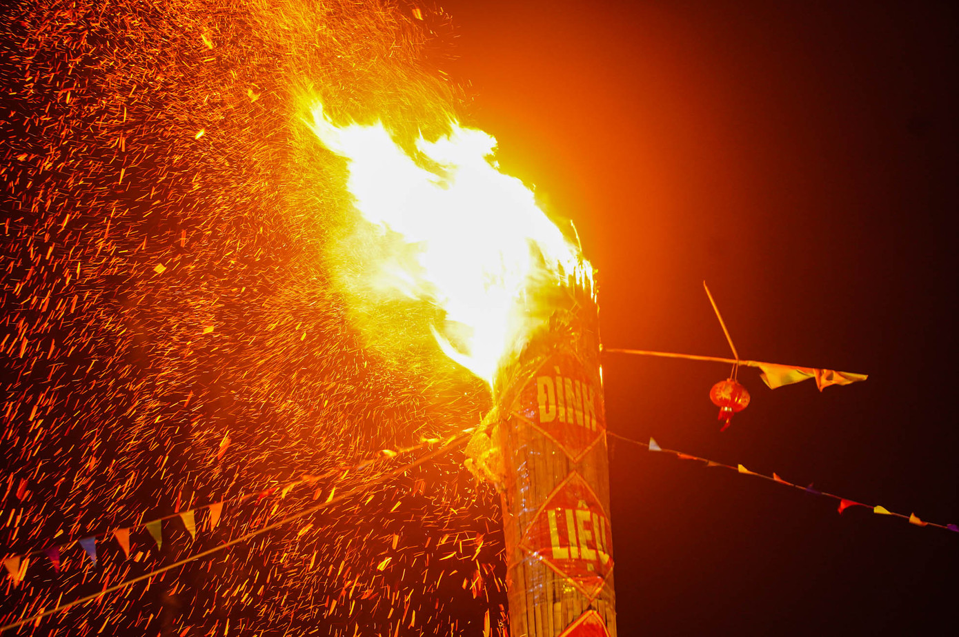 Cây đình liệu được dân làng dựng và làm thủ công từ hàng chục cây tre kết hợp với lửa và củi.