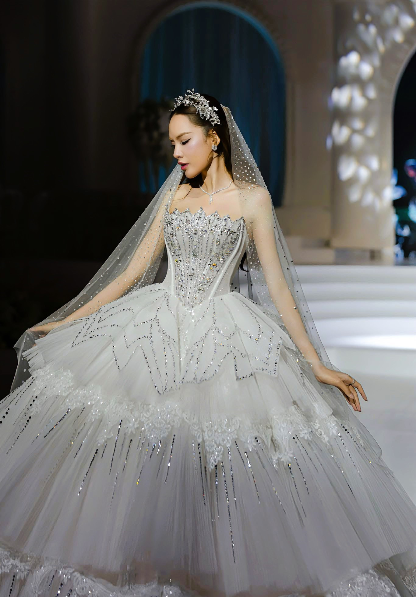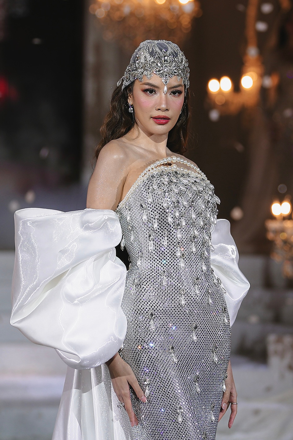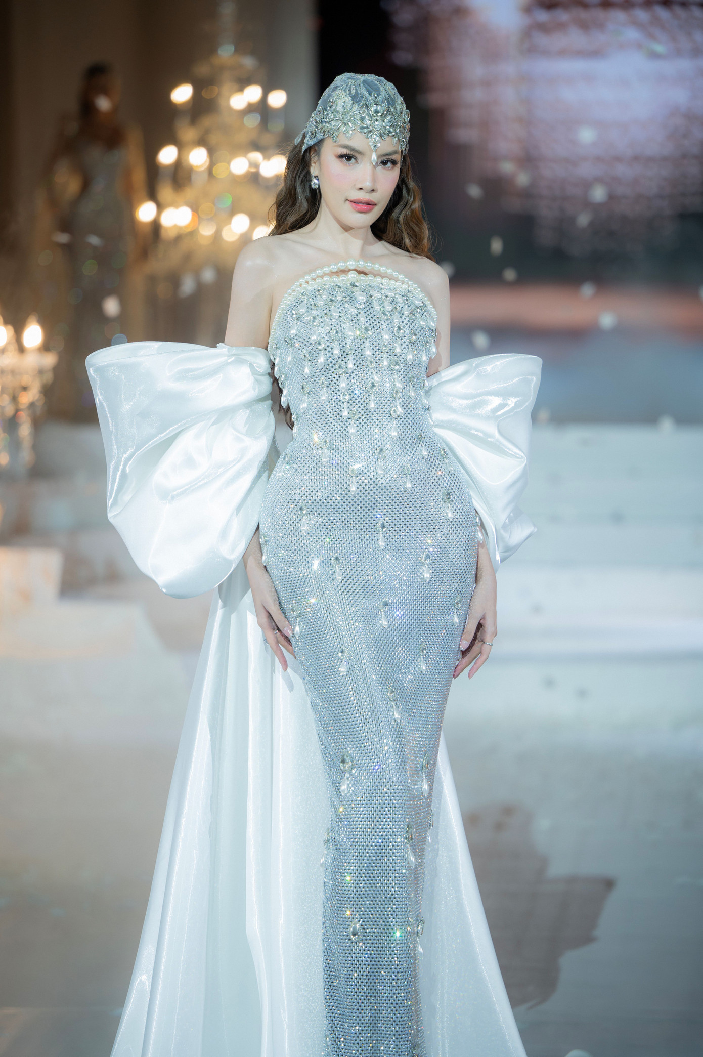 Mở màn cho tuần lễ thời trang, Lê Hoàng Phương giữ vị trí 'vedette' cho bộ sưu tập cưới mới nhất của nhà thiết kế Chung Thanh Phong, một cái tên đình đám trong làng thời trang Việt. Với thần thái cuốn hút, kỹ năng catwalk điêu luyện và biểu cảm sân khấu đầy cảm xúc, 'nàng Hậu' ngay lập tức trở thành tâm điểm của đêm diễn mở màn.