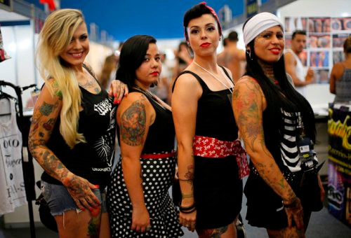 Các cô gái trẻ chụp ảnh kỷ niệm khi tham gia lễ hội xăm quốc tế tại Brazil.