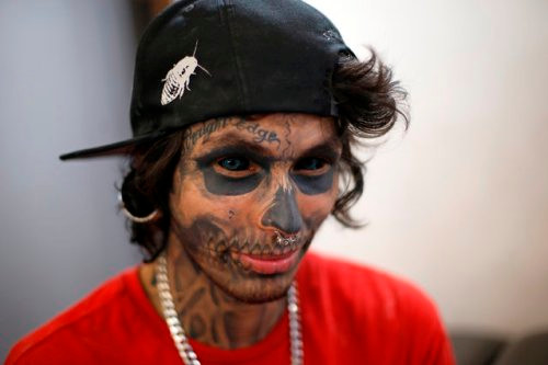 Một nghệ sĩ xăm người Brazil có khuôn mặt độc đáo đang chờ khách hàng.