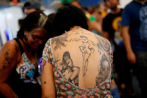 Các cô gái vui vẻ khi được làm thêm những hình xăm mới trong lễ hội xăm hình quốc tế tại Rio de Janeiro.