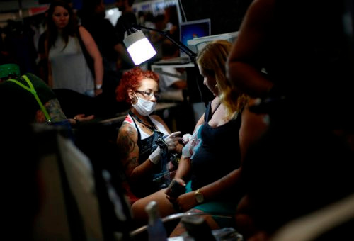 Nghệ sĩ xăm trổ đang "trang điểm" cho cánh tay của một cô gái. Dịp này là cơ hội lớn cho những ai muốn có thêm hình xăm độc đáo và chất lượng.