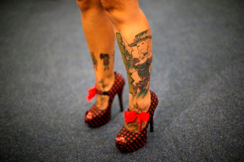 Một cô gái cá tính khoe những hình xăm trên chân và đôi giày thắt nơ đỏ nổi bật của mình tại lễ hội.