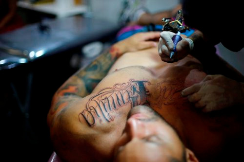 Một người đàn ông quyết định xăm lên ngực mình chữ "Family" (gia đình) tại lễ hội.
