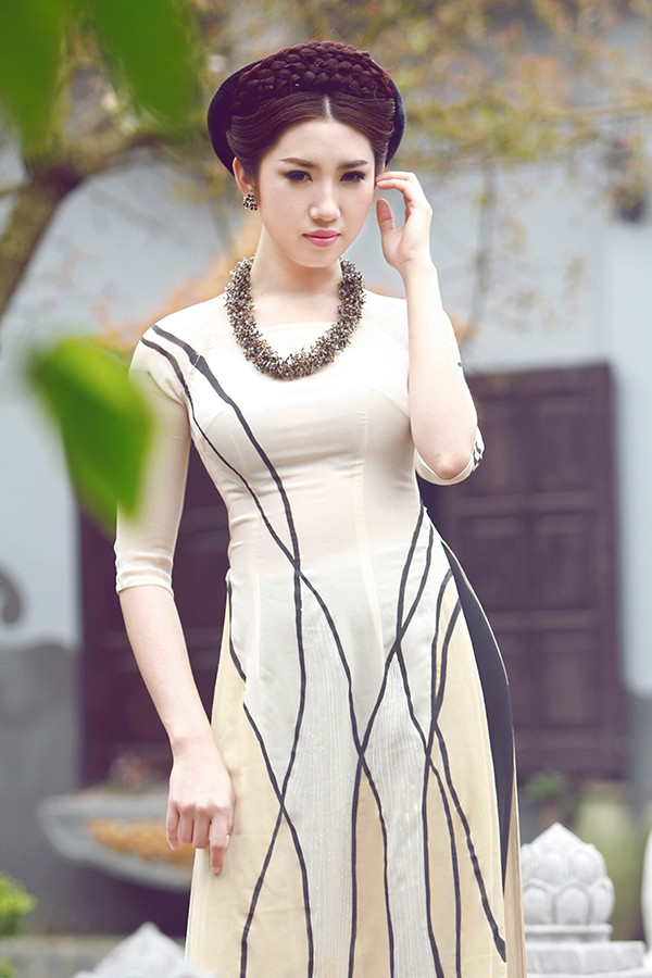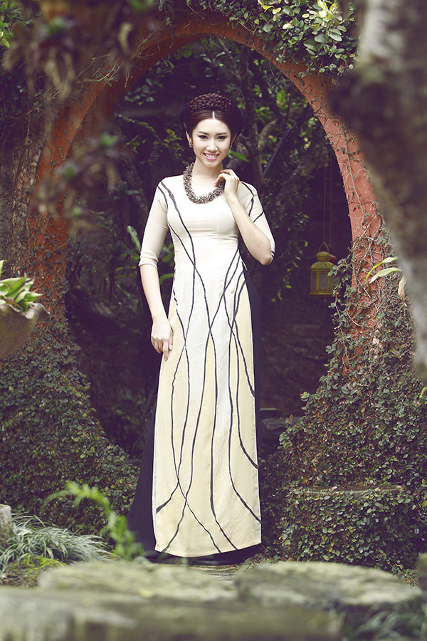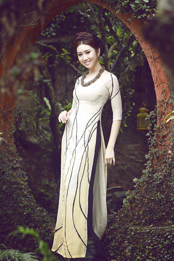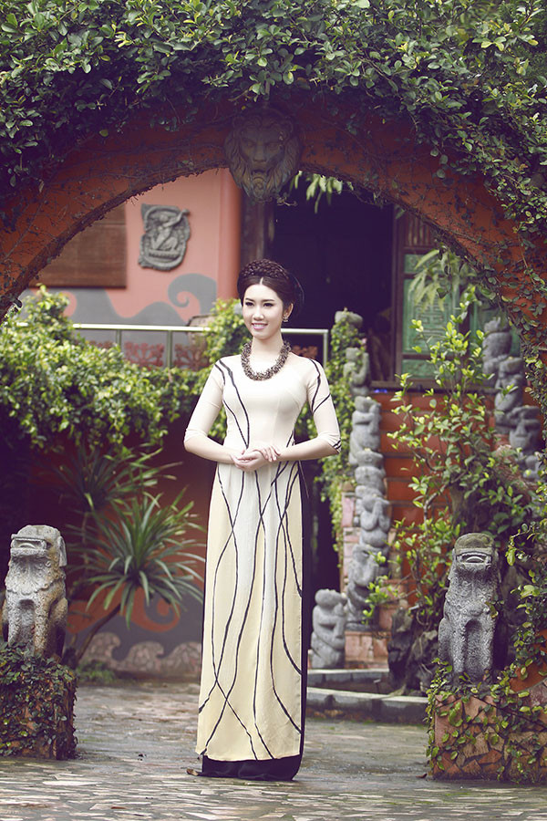 Lê Huỳnh Thúy Ngân xinh đẹp với áo dài màu nude in họa tiết tinh tế.