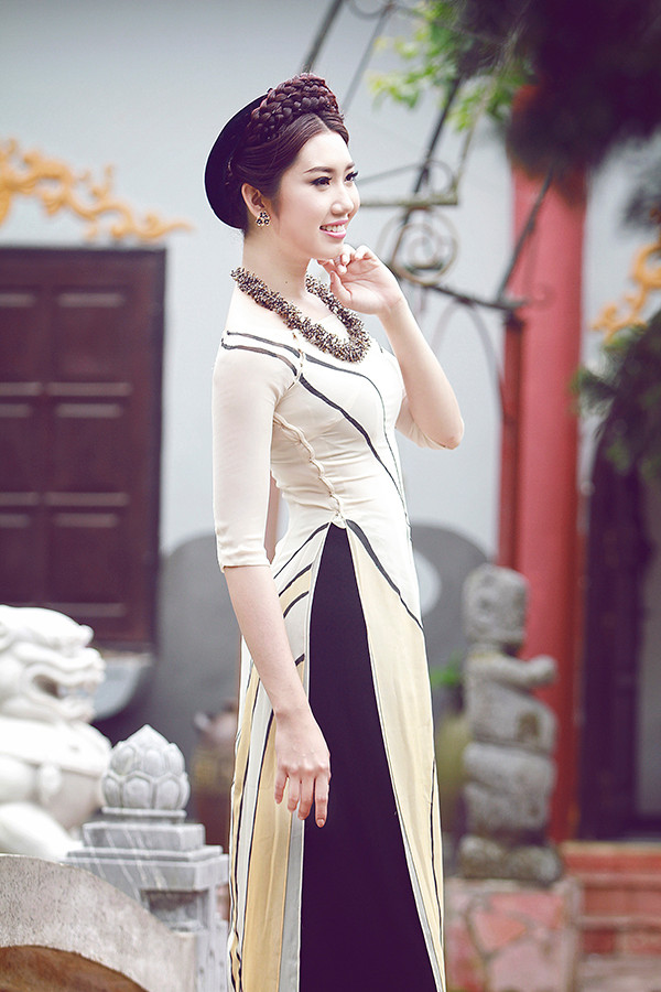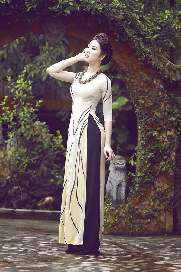 Tà áo dài truyền thống vốn đã rất quyến rũ, được thiết kế bằng vải màu nude càng khiến người mặc sở hữu vẻ đẹp khó rời mắt.