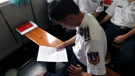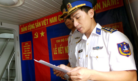 Thượng úy Lê Hồng Châu - Bí thư Chi bộ, Chính trị viên tàu CSB 4034 - đọc Quyết định Kết nạp Đảng.