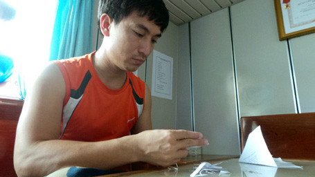 Thượng úy Lê Hồng Quân - Bí thư Chi bộ, Chính trị viên tàu CSB 4034 - cùng cán bộ, chiến sĩ trên tàu trang trí cho buổi lễ.
